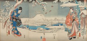 Affiche Blue art "HIROSHIGE ANDO – Snowy landscape with a woman and a man 1853"