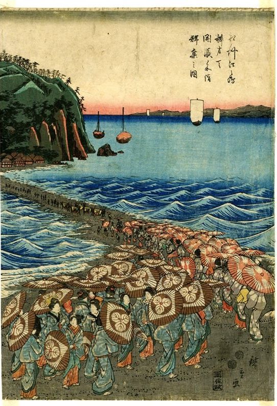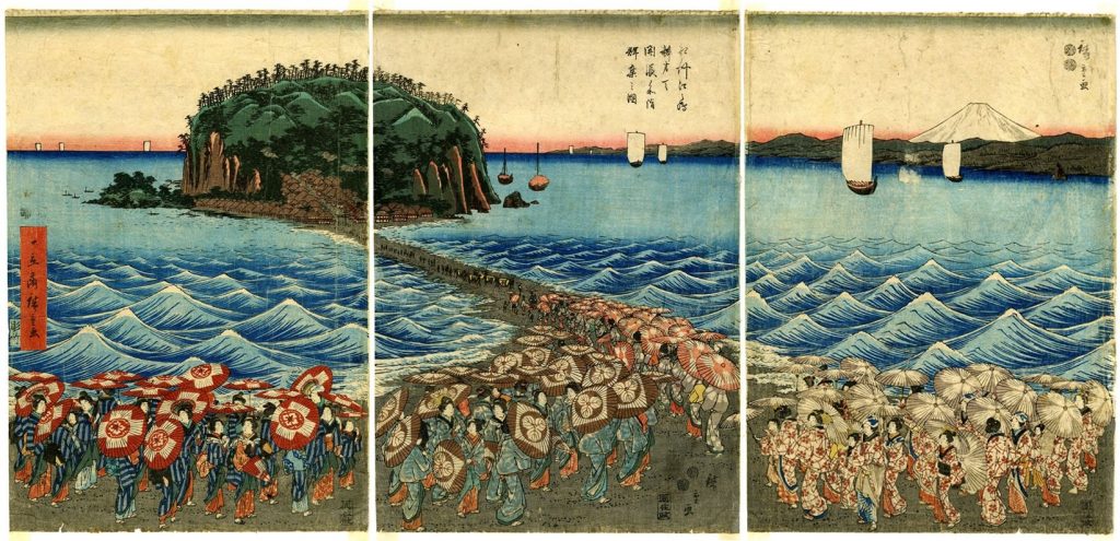 Célébration de l’inauguration de Benzaiten d’Andō Hiroshige est une estampe en triptyque animée représentant une foule rassemblée pour une fête religieuse en l’honneur de la déesse Benzaiten, divinité des arts, de l’eau et de la musique. La scène montre des lanternes, des stands et des visiteurs dans un décor vivant, souvent situé près d’un sanctuaire ou d’un plan d’eau. Par une composition riche en détails et en mouvement, Hiroshige illustre la vitalité des fêtes populaires d’Edo, mêlant ferveur spirituelle et ambiance festive avec poésie et réalisme.