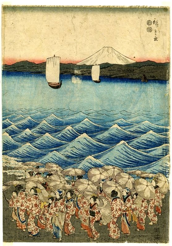 Célébration de l’inauguration de Benzaiten d’Andō Hiroshige est une estampe en triptyque animée représentant une foule rassemblée pour une fête religieuse en l’honneur de la déesse Benzaiten, divinité des arts, de l’eau et de la musique. La scène montre des lanternes, des stands et des visiteurs dans un décor vivant, souvent situé près d’un sanctuaire ou d’un plan d’eau. Par une composition riche en détails et en mouvement, Hiroshige illustre la vitalité des fêtes populaires d’Edo, mêlant ferveur spirituelle et ambiance festive avec poésie et réalisme.