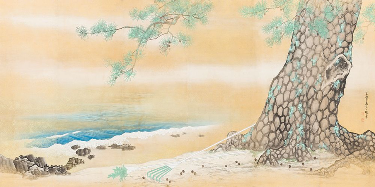 Takasago est une peinture de style nihonga inspirée de la célèbre légende japonaise de Takasago, symbole d’harmonie conjugale et de longévité. L’œuvre représente généralement un vieux couple — les esprits des pins de Takasago et Sumiyoshi — dans un paysage côtier paisible, souvent accompagné de pins jumeaux.