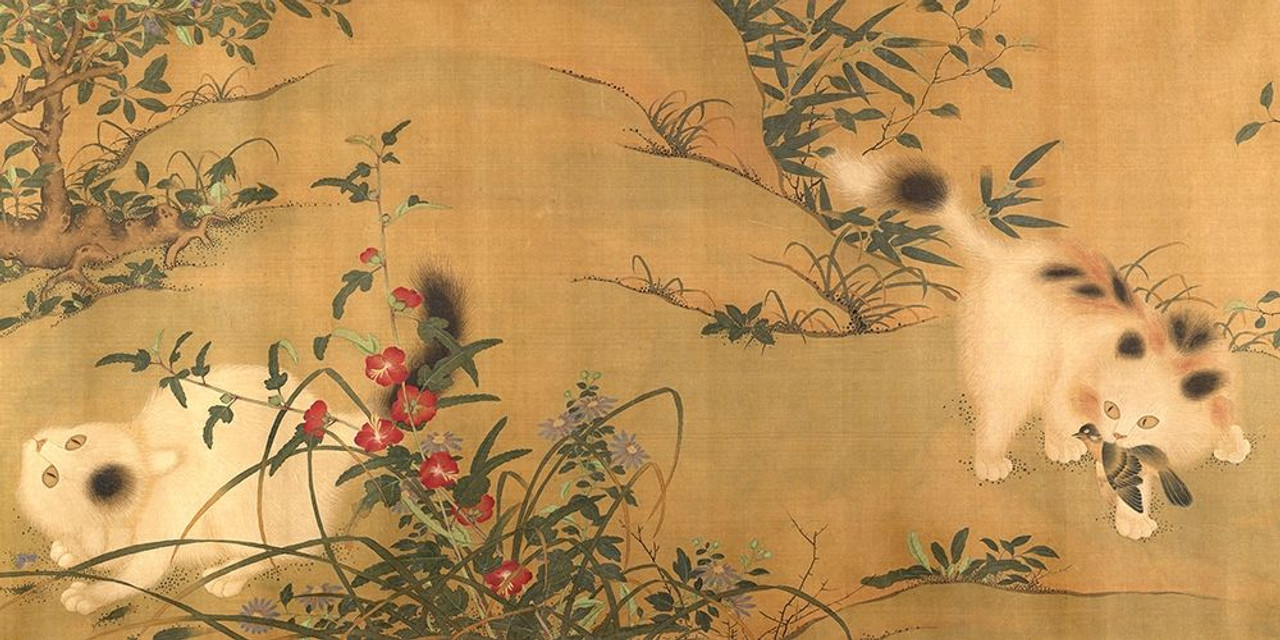 Spring Play in a Tang Garden est une estampe raffinée évoquant une scène de loisir entre des chatons dans un jardin chinois de la dynastie Tang.