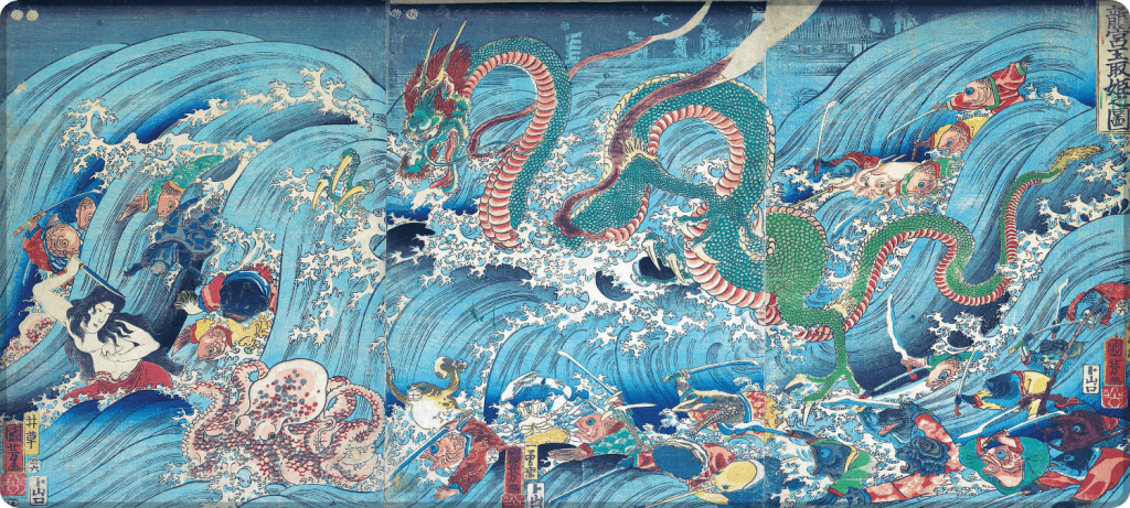 Recovering a Jewel from the Palace of the Dragon King est une estampe spectaculaire inspirée du folklore japonais et des légendes marines. Elle représente une scène héroïque où un personnage plonge dans le palais sous-marin du Roi-Dragon (Ryūjin) pour récupérer un joyau précieux.