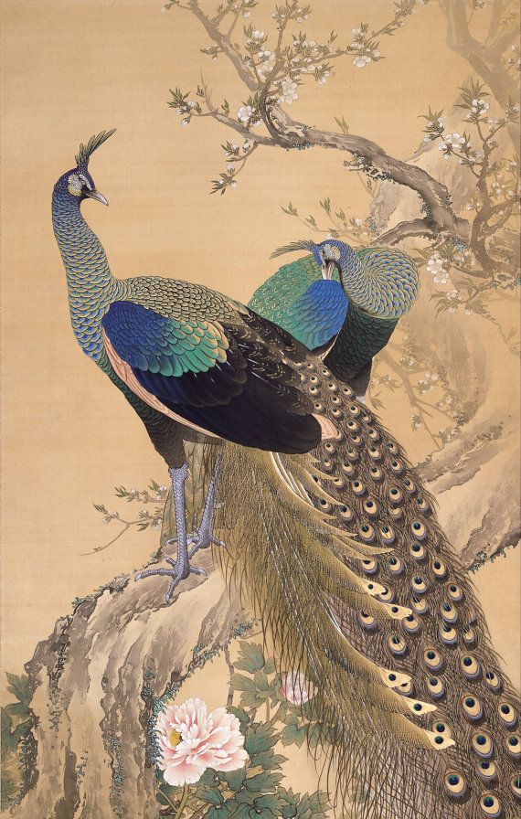 Les paons, symboles de beauté et de noblesse, sont entourés de fleurs de saison, créant une scène harmonieuse et vivante. L’œuvre se distingue par son sens du détail, ses couleurs subtiles et son équilibre entre réalisme et poésie, typique de l’esthétique japonaise traditionnelle.